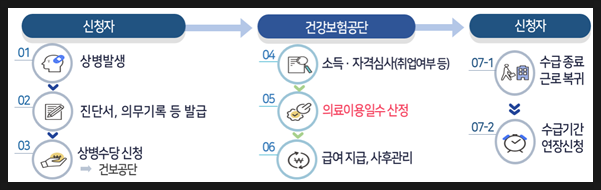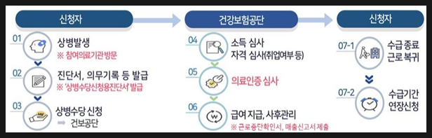 - 신청 절차: 참여의료기관에서 진료 후 '상병수당 신청용 진단서' 발급, 14일 이내에 필수 구비서류와 함께 공단에 신청.