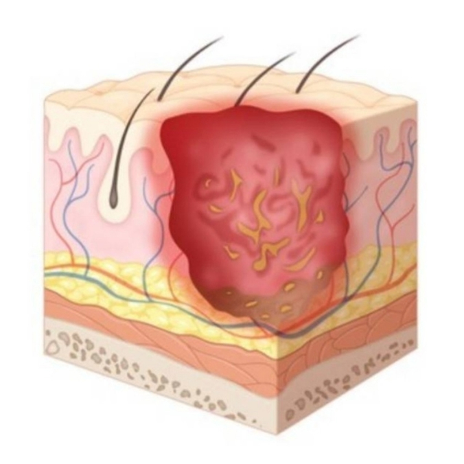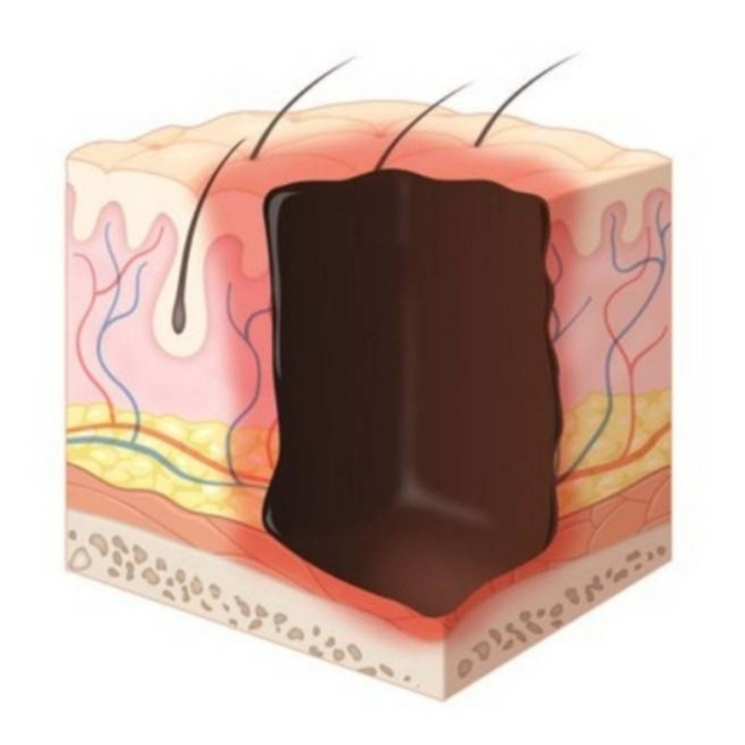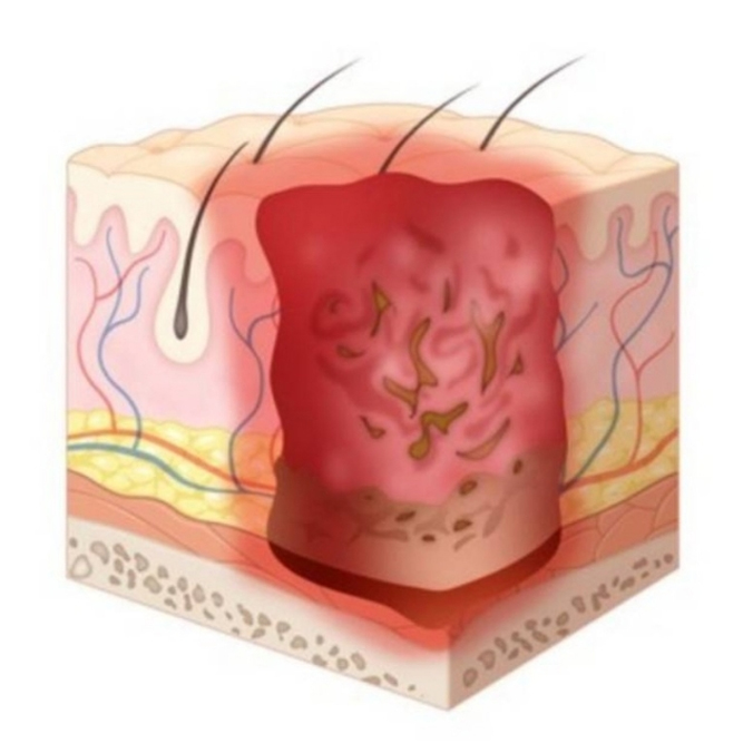 피하조직 피부 괴사 표피, 진피와 더블어 피라조직 일부까지 손상 주로 노란색의 괴사조직과 상처가 파여 있다. ※ 적극적 치료로 욕창이 4단계로 악화되는것을 막아야 하는데 몇달이 소요 될 수 있다. |