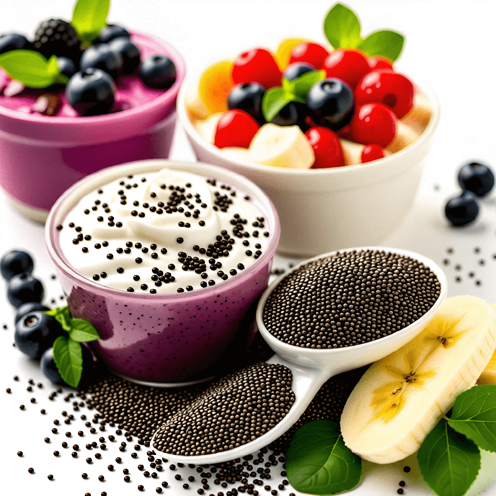 치아씨드는 1큰술당 58kcal로 칼로리가 낮으면서도 2g의 단백질을 제공합니다. 식물성 단백질과 오메가-3 지방산을 함유하고 있어 체중 감량과 근육 유지에 도움이 됩니다. 스무디나 요거트에 첨가하여 섭취할 수 있습니다.